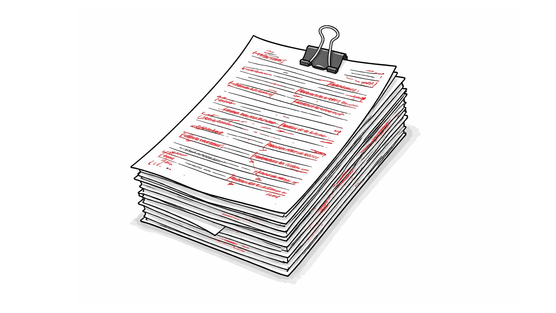 El documento es tan voluminoso que se requirieron clips de carpeta para entregarlo físicamente. Son 125 páginas —divididas en cuatro capítulos— llenas de reglamentos y artículos de leyes con tachas y párrafos agregados, en rojo todo, como se estila en el control de cambios en Word.